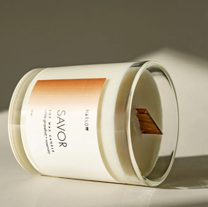 This essential oil, soy candle is fashioned with a wood wick for aesthetic and clean burn.