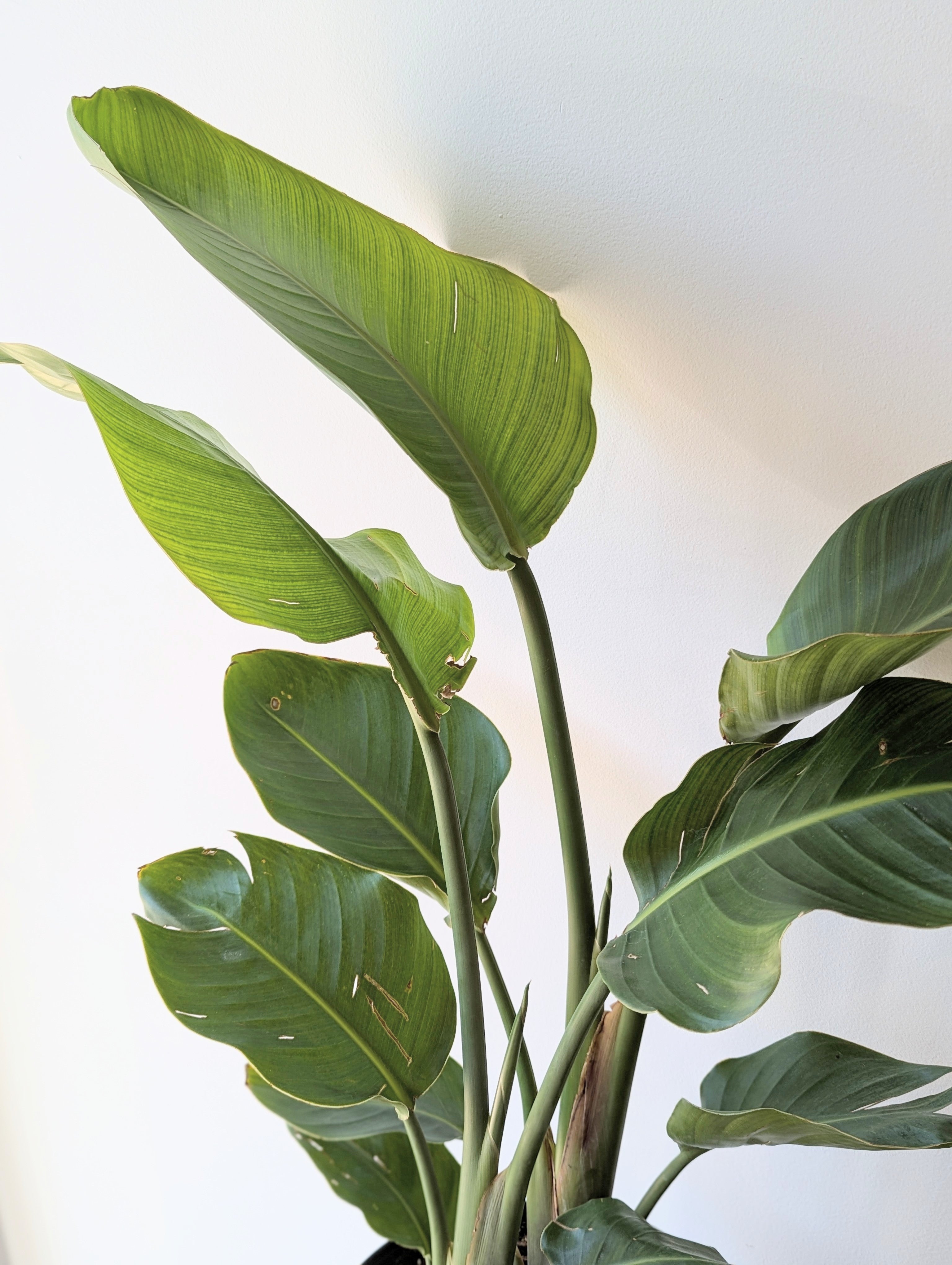 The large leaves of the Bird of Paradise are glorious! The glossy green leaves create a tropical oasis wherever they are placed. Bird of Paradise rarely bloom indoors, but can potentially bloom with enough full sun.