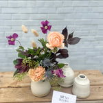 Each piece features seasonal stems like clematis and ranunculus, arranged in a slightly moody palette of peaches, burgundies, blues, and taupes β an elegant nod to the shifting seasons.