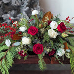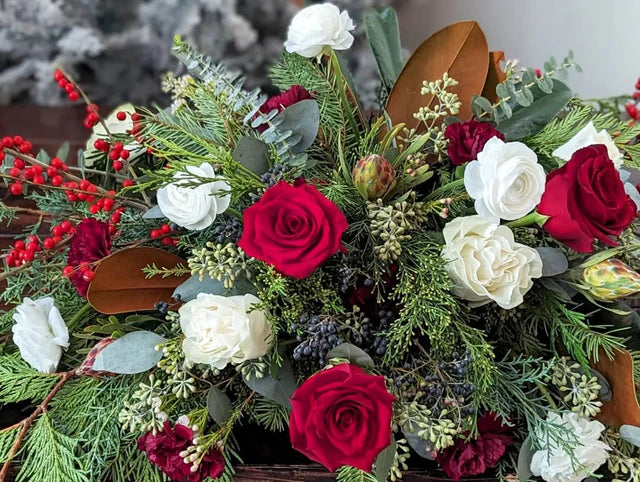 A celebration of the season’s most joyful hues. Sleigh Bells Ring features a lush mix of red and white blooms — roses, ranunculus, leucadendron, ilex berries, magnolia leaves, eucalyptus, and fragrant evergreens — artfully arranged to bring warmth and cheer to your holiday gatherings.