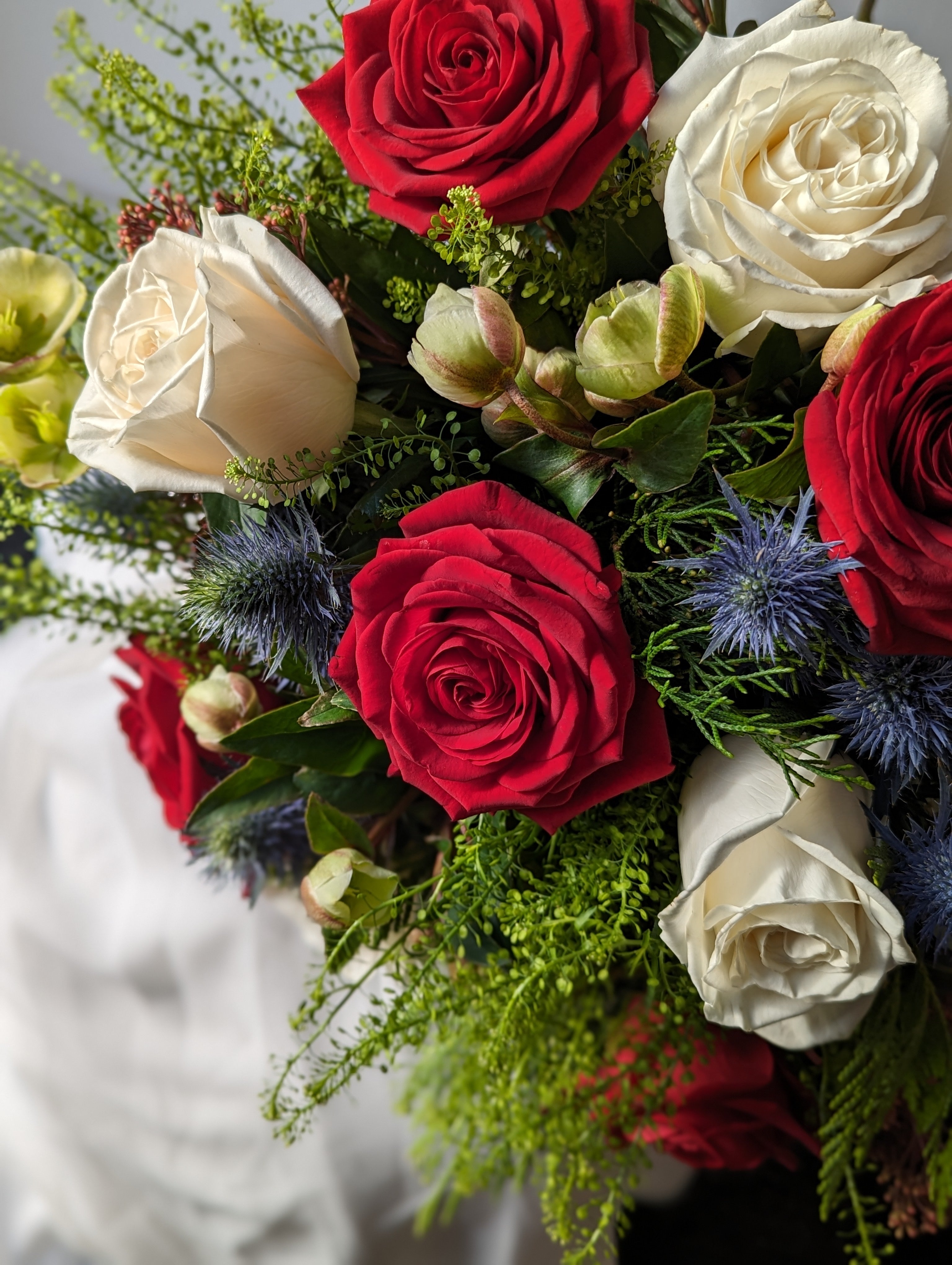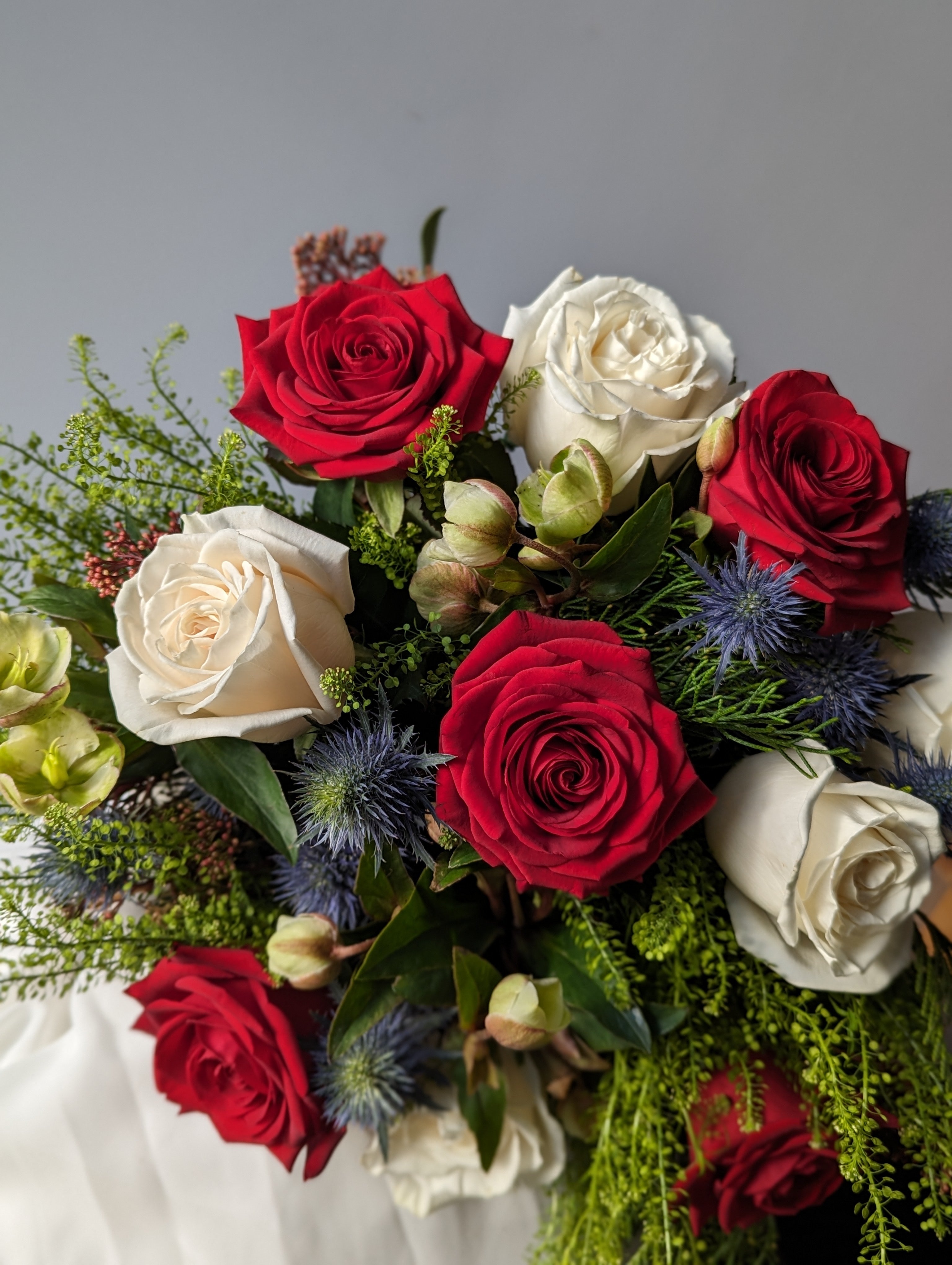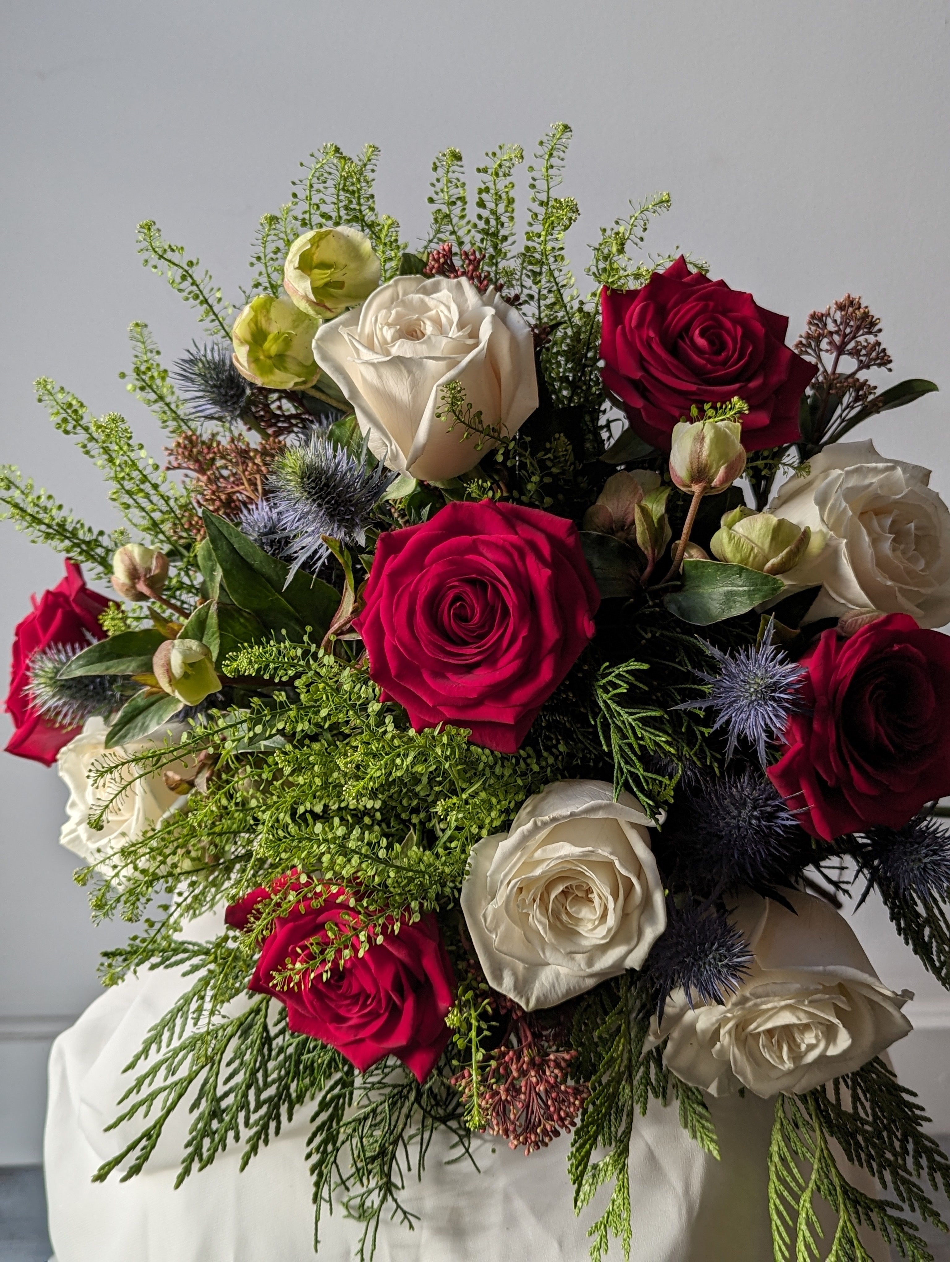 A classic winter palette, reimagined. Crimson & Snow is a lush, full bouquet of rich red and soft white roses, layered with cool blue and green accent blooms and finished with fragrant winter greens. Designed with movement and depth, this arrangement feels timeless yet fresh — the kind of bouquet that stops you mid-step.