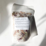 Premium Epsom salt, Himalayan pink salt, sea salt, tapioca starch, essential oil blend (bergamot, white grapefruit, rose geranium, ylang ylang, jasmine absolute and neroli), dried rose petals, dried jasmine flowers