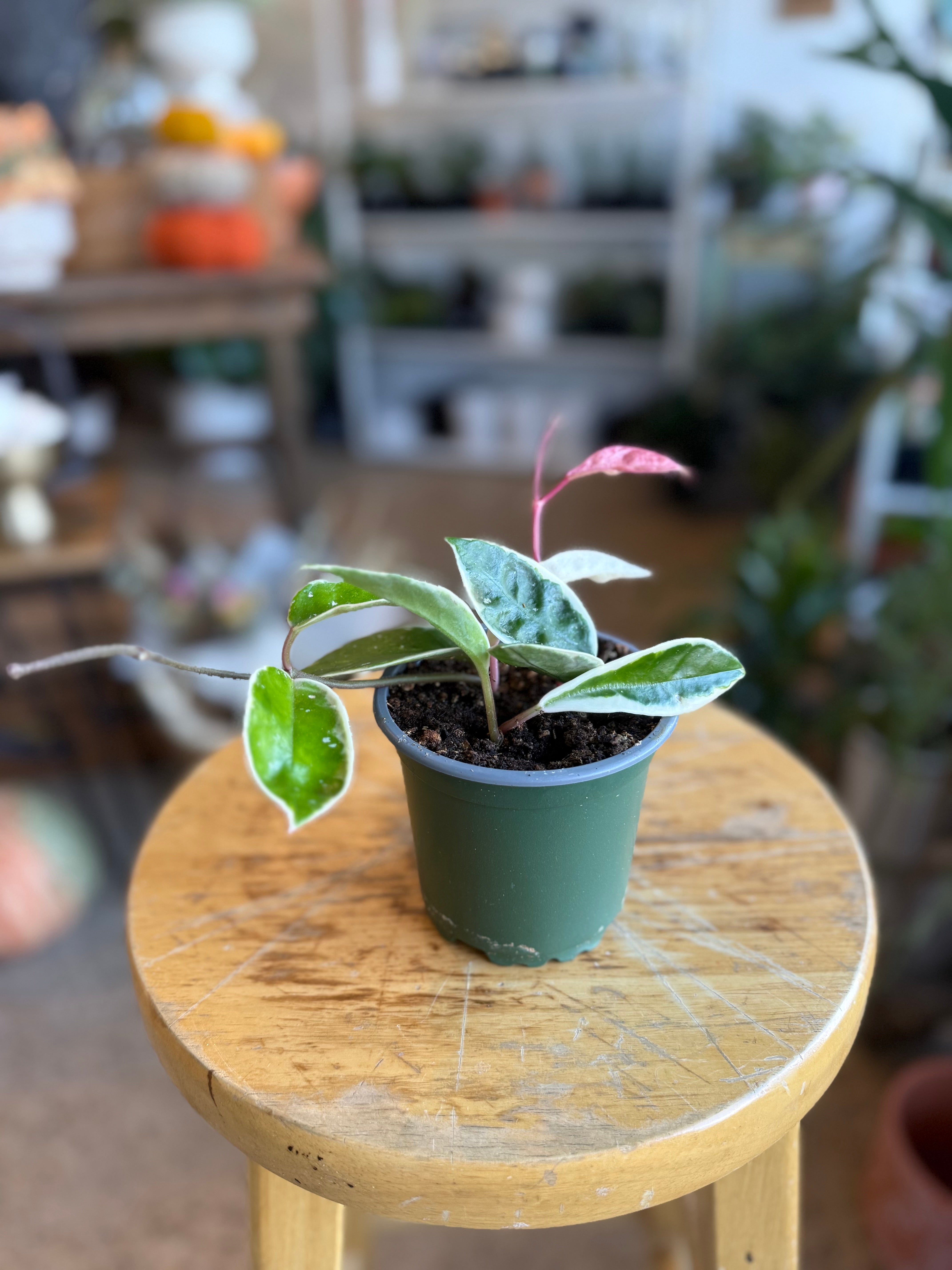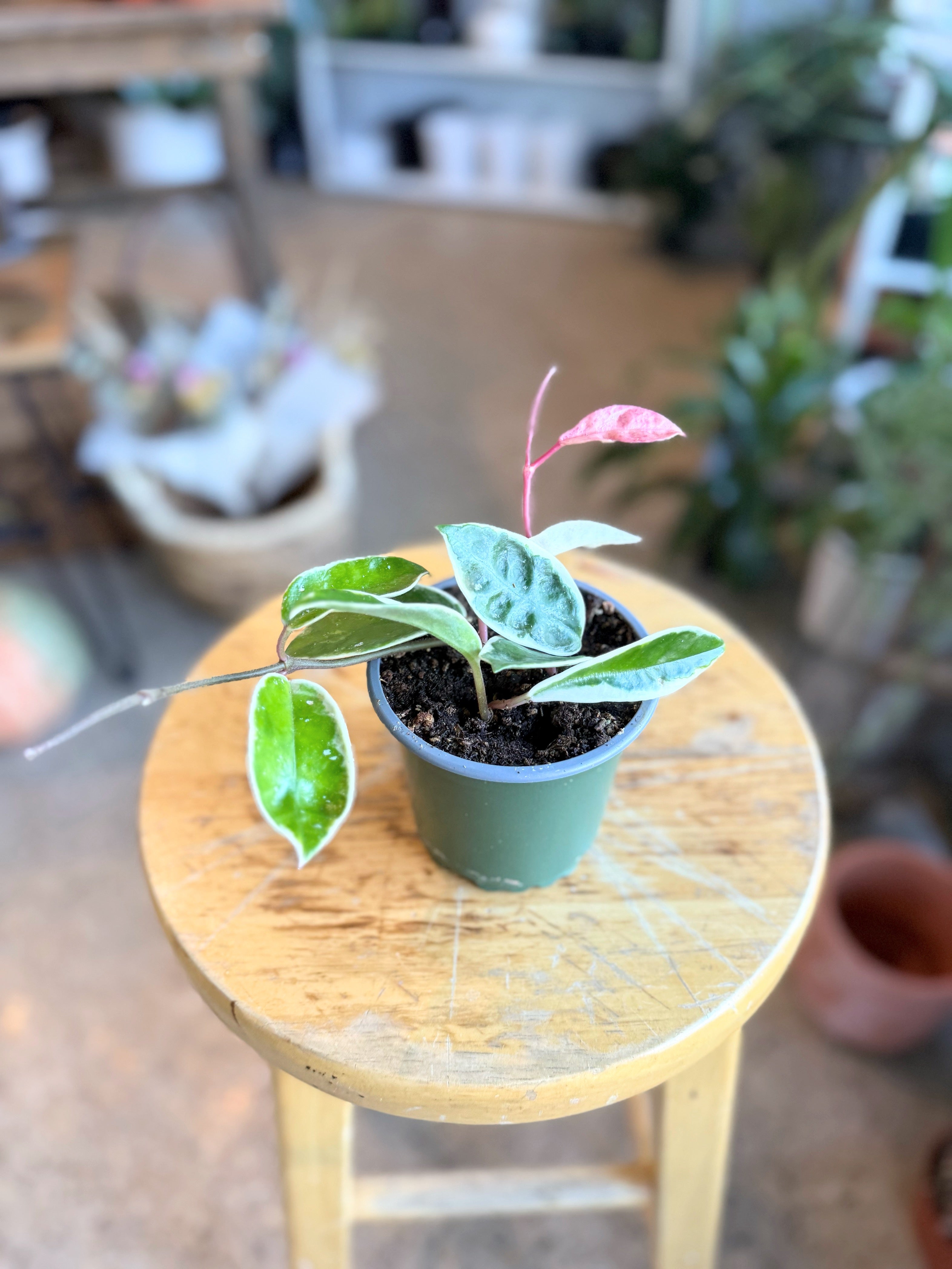 Hoya tricolor, aka Hoya carnosa 'Tricolor' or wax plant, is a fun trailing succulent with shiny leaves splashed in green, white, and pink. It loves bright, indirect light and prefers its soil to dry out between sips. Easy to care for and perfect for hanging baskets, it also treats you to pretty clusters of fragrant, star-shaped flowers—bringing color and charm wherever it climbs!