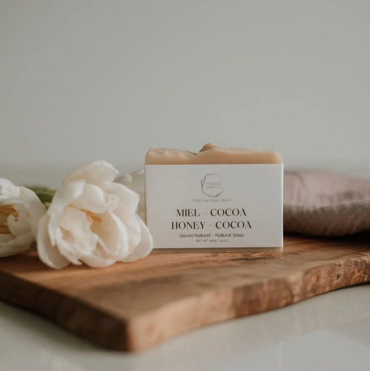HONEY & COCOA - Natural Soap is a fragrance-free bar soap enriched with locally sourced raw honey. With its known antibacterial qualities and rich antioxidants, it helps eliminate excess oil on the skin's surface. Raw honey also hydrates the skin, resulting in a soft, radiant, and glowing complexion. The inclusion of unrefined cocoa butter provides a subtle chocolate scent and moisturizing benefits for dry and sensitive skin.