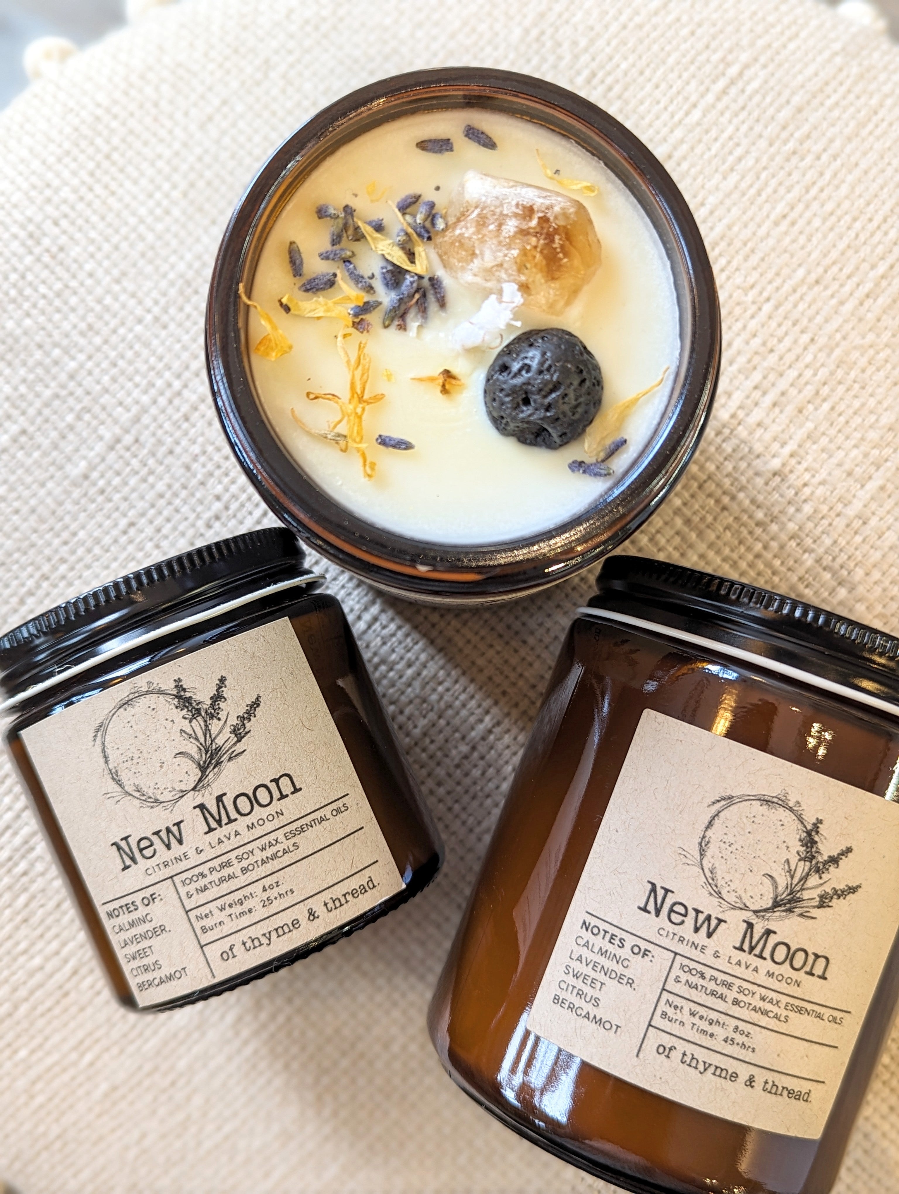 🌑 New Moon: Scented with lavender and bergamot essential oils, topped with calendula petals, lavender buds, citrine, and black lava.