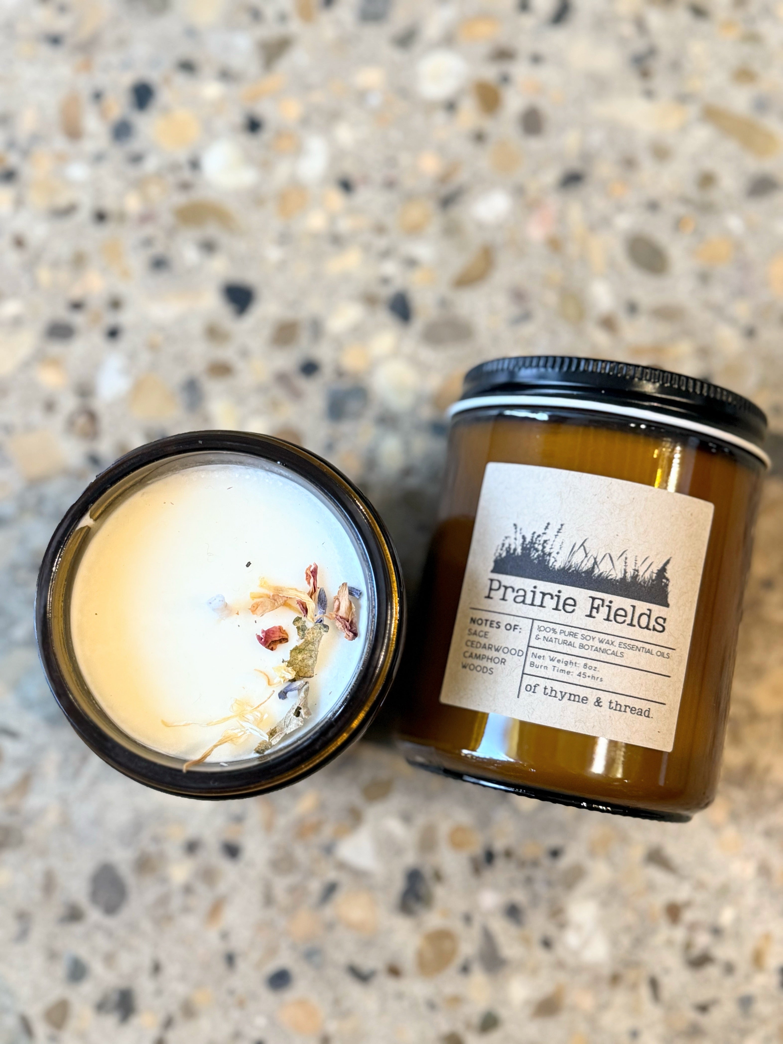 Experience the calming essence of nature with our Prairie Fields Candle. Infused with the aroma of a summer breeze, this candle will transport you to a peaceful prairie field filled with native flowers and grasses. Enhance your surroundings and relax with our holistic candle, perfect for creating a serene atmosphere. Topped with dried wildflower petals.