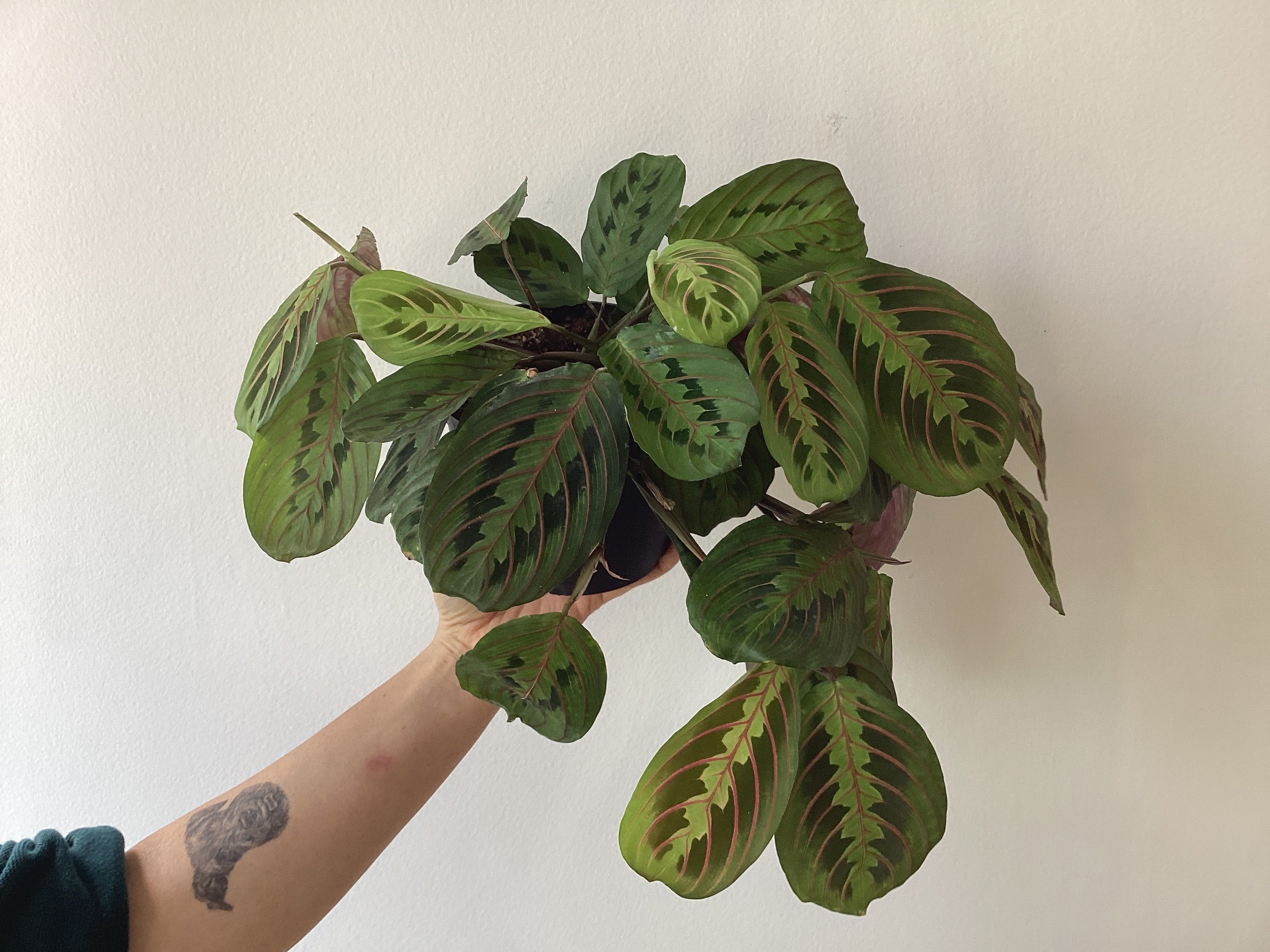 An instantly recognizable plant with distinctive striped foliage. The Prayer Plant gets its name from its leaves which lay flat during the day and fold up at night like praying "hands". Prayer Plants thrive in bright, indirect sunlight and prefer moderate watering.