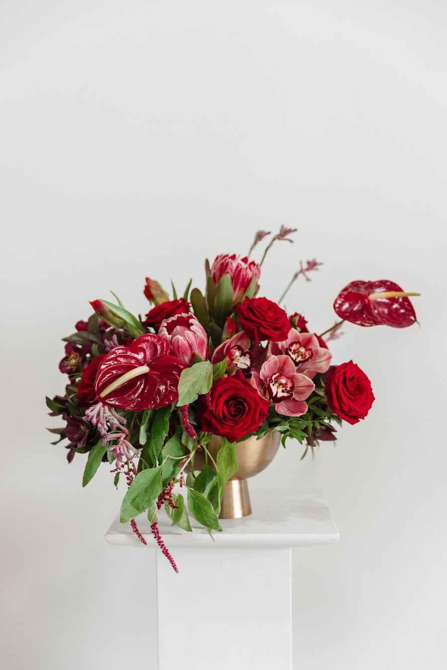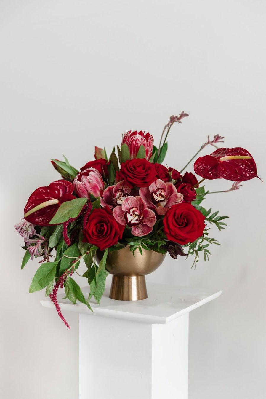 The Forever Yours Arrangement is a luxe combination of unique tropical flowers and timeless lush red roses. Carefully arranged in a brushed gold pedestal vase, these blooms will be sure to make an impact on your partner's heart. This is the arrangement to send when you want to express your love in a exceptional way!