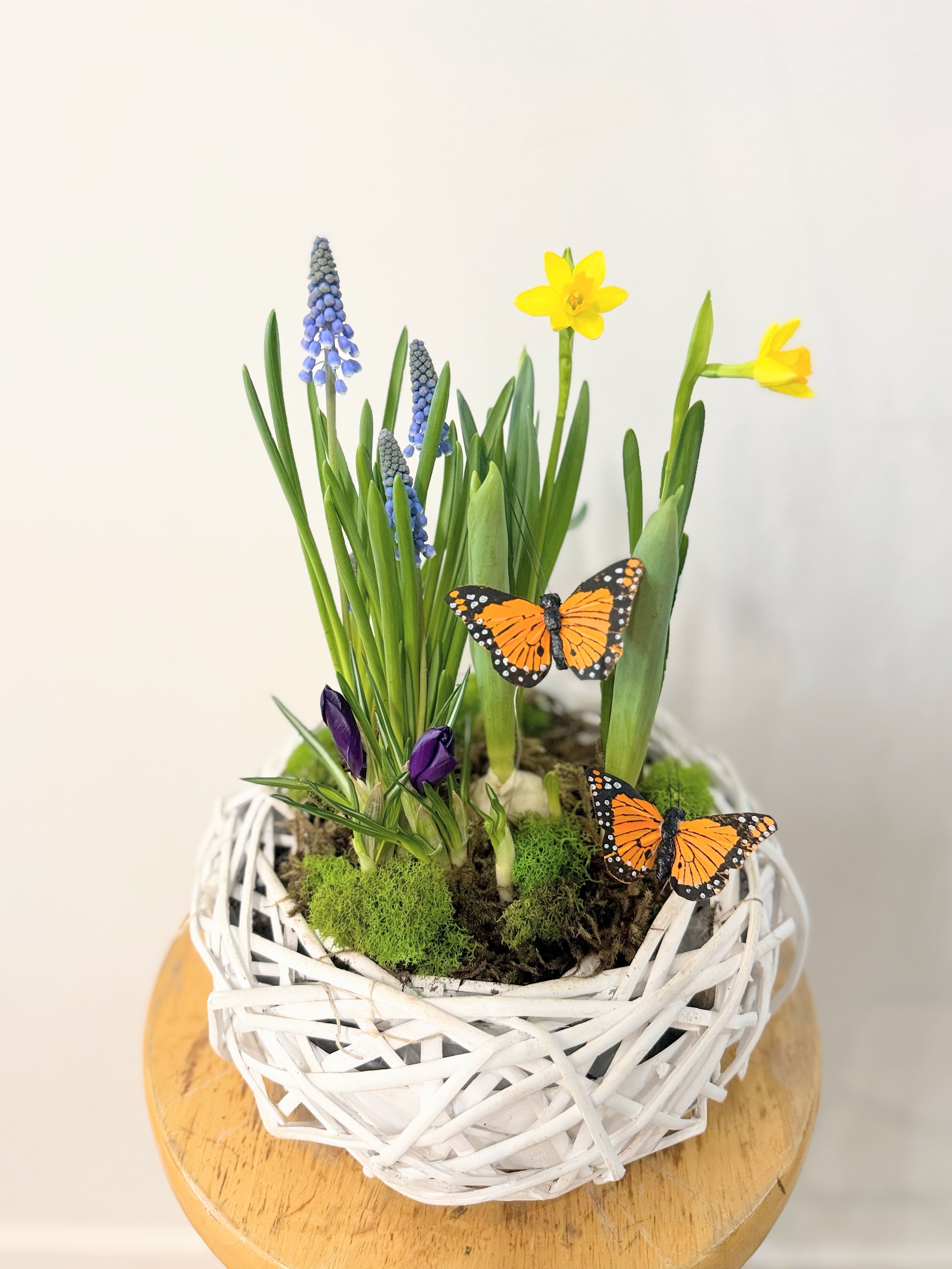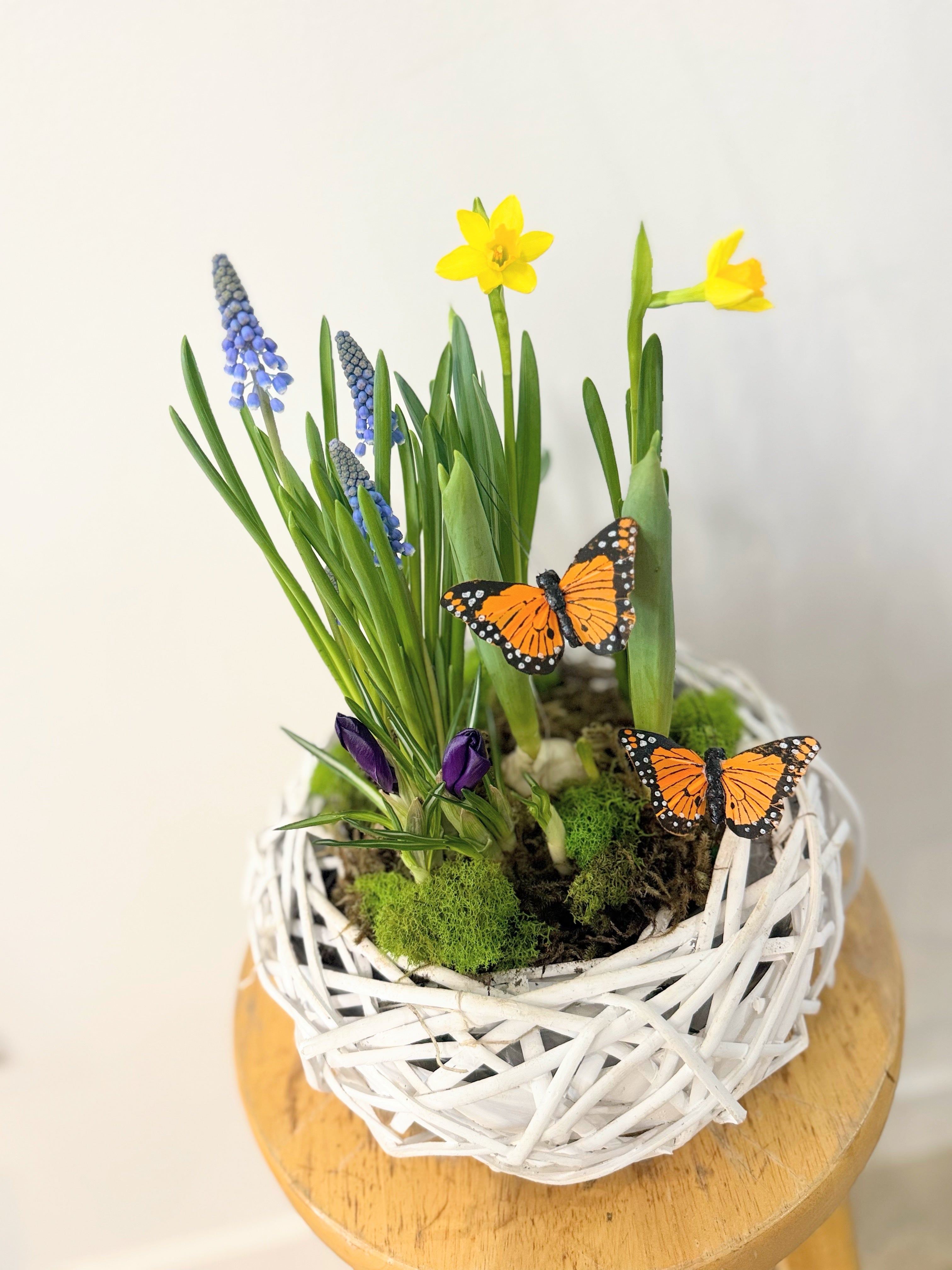 This garden-inspired plant arrangement features blooming bulb plants like tulips, daffodils, crocus, and hyacinth — planted in a neutral wicker pot with soft forest moss and soil. It’s a fresh, living piece designed to grow, blossom, and bring a gentle breath of the season indoors.