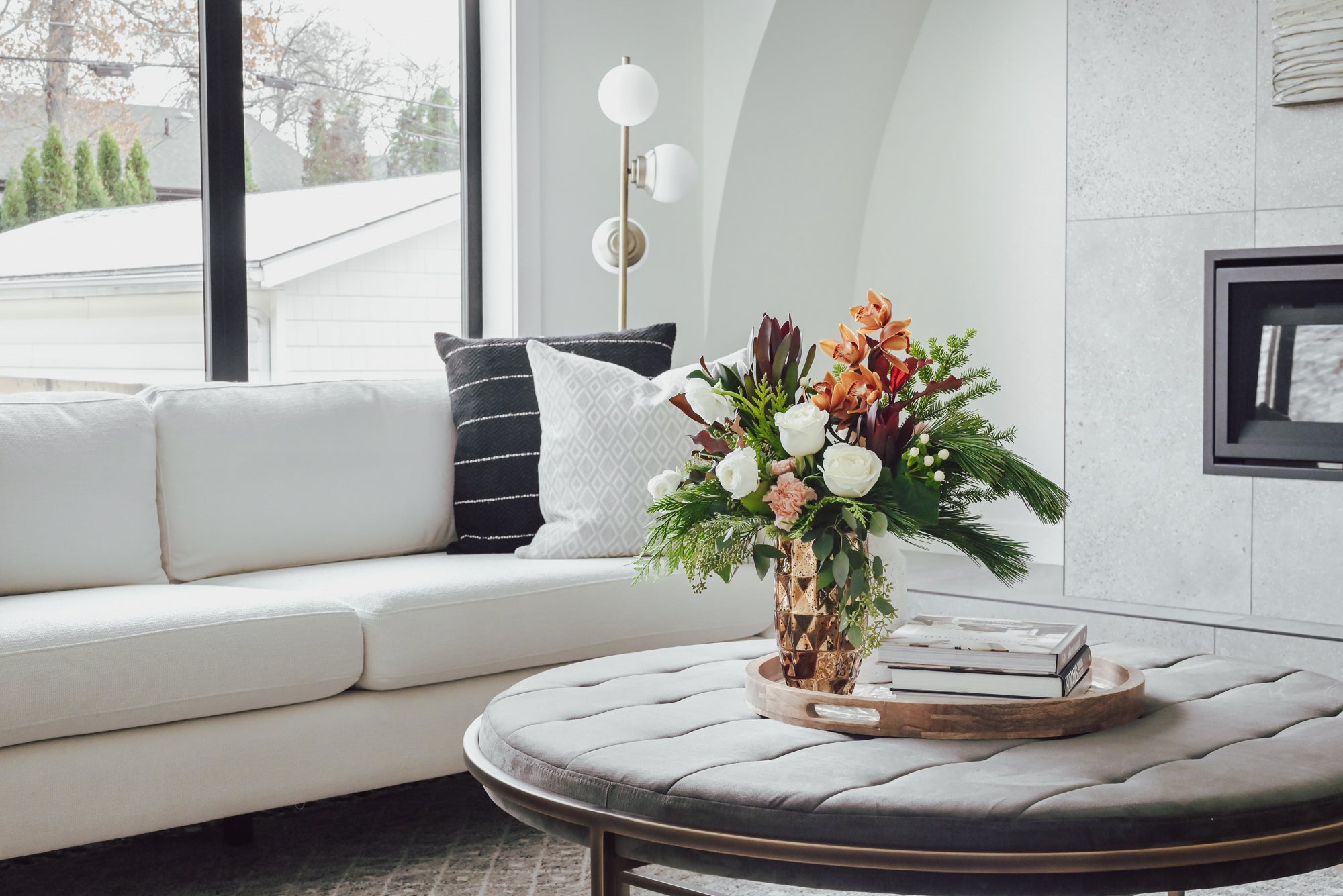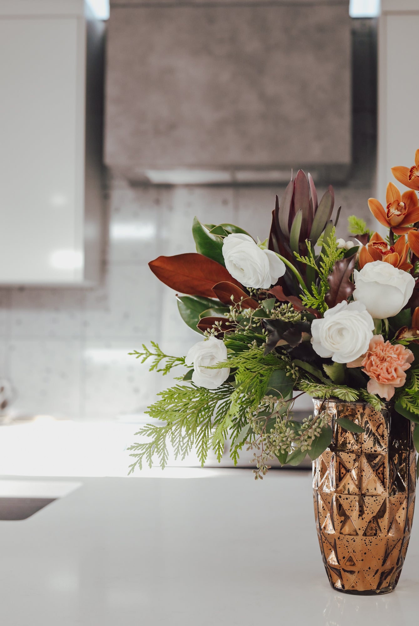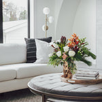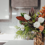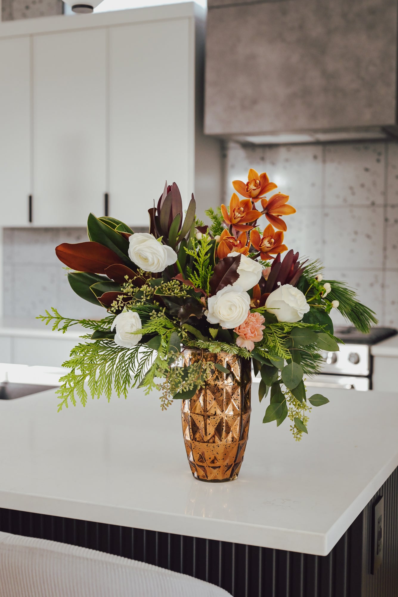 A contemporary design featuring tropical flowers such as cymbidium orchids and leucadendron, interspersed with crisp white florals such as roses and ranunculus. It's the perfect blend of sweet and spicy/classic and unexpected. Arranged in a mercury glass vase, this luxe arrangement makes a statement on a kitchen island, front counter, or side table.