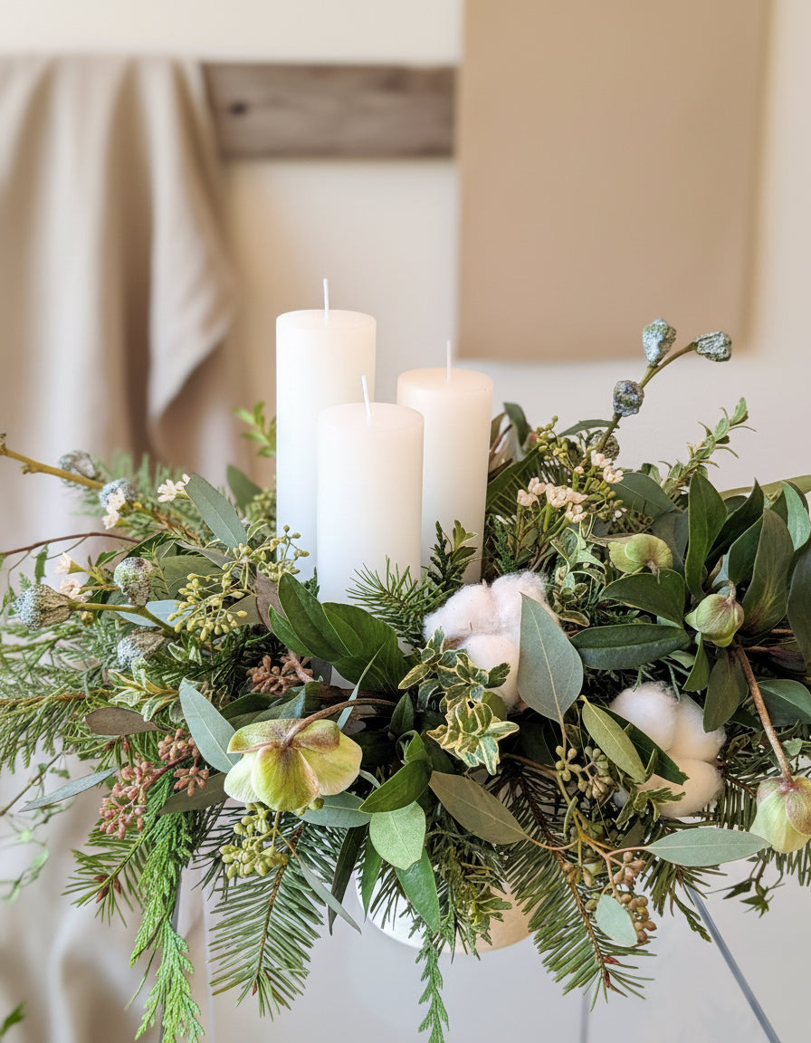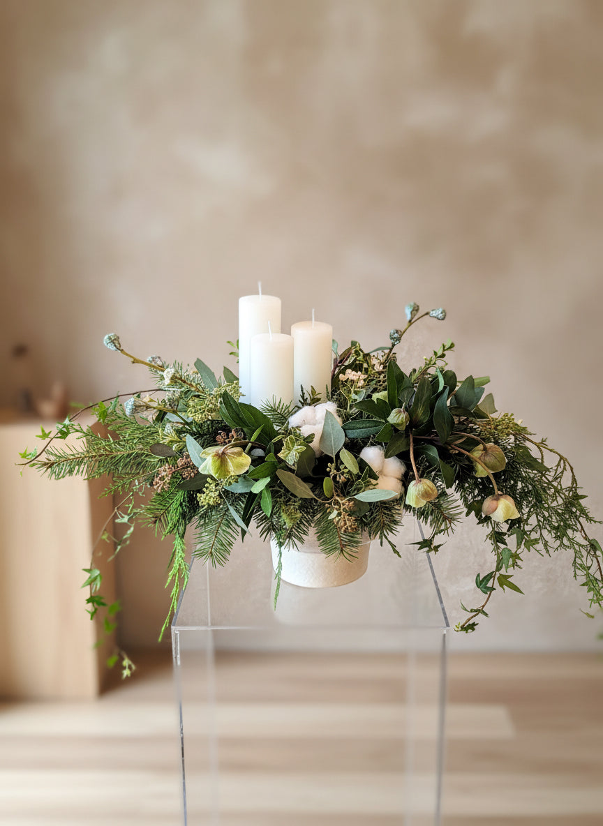 Bring timeless elegance to your holiday celebrations with this stunning centrepiece. Featuring three stately pillar candles in a large contemporary compote vase, this arrangement is a lush display of fresh evergreens, delicate helleborus blooms, rustic eucalyptus pods, and soft cotton stems. Perfect for gracing your dining table or adding warmth to your mantle, this design combines natural textures with graceful simplicity, creating an ambiance of festive sophistication.