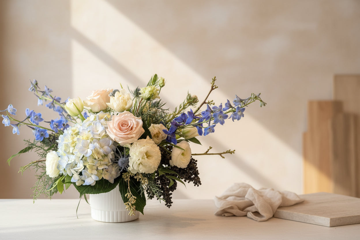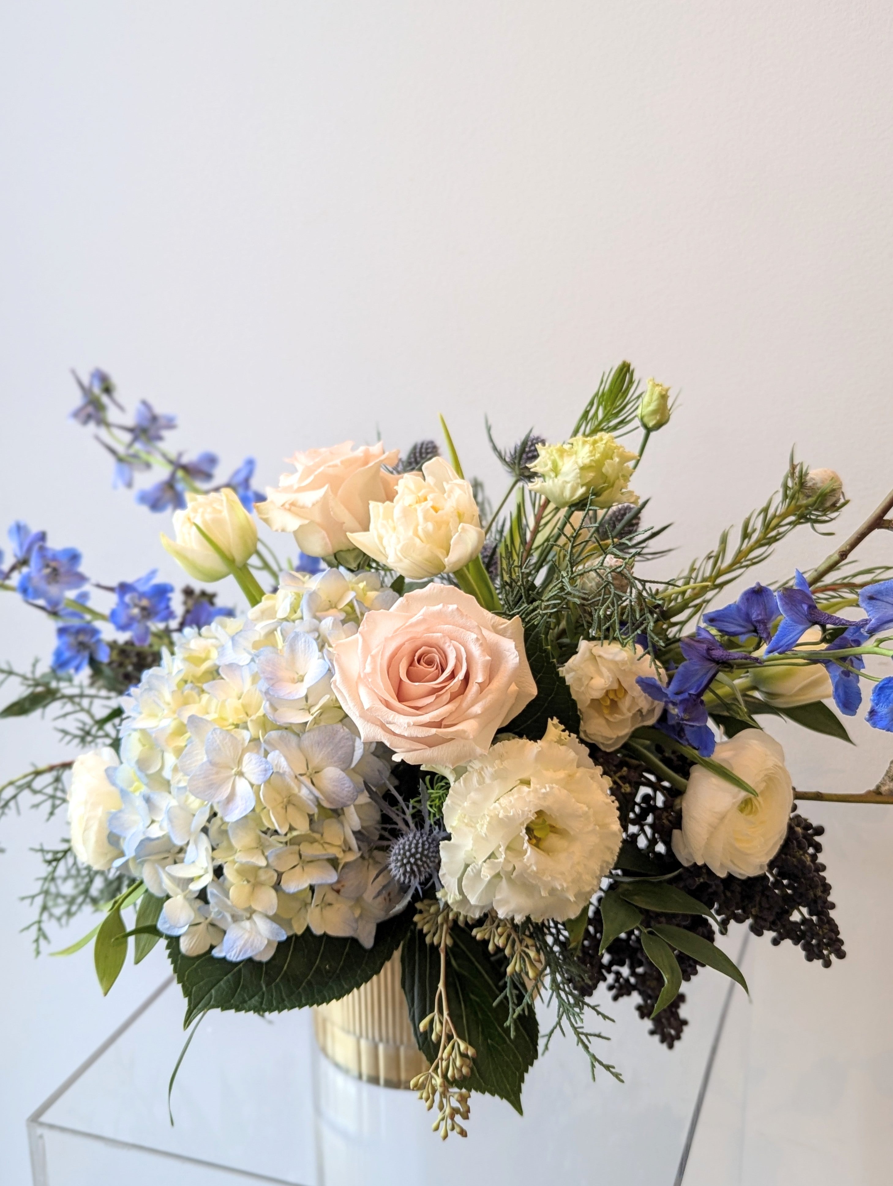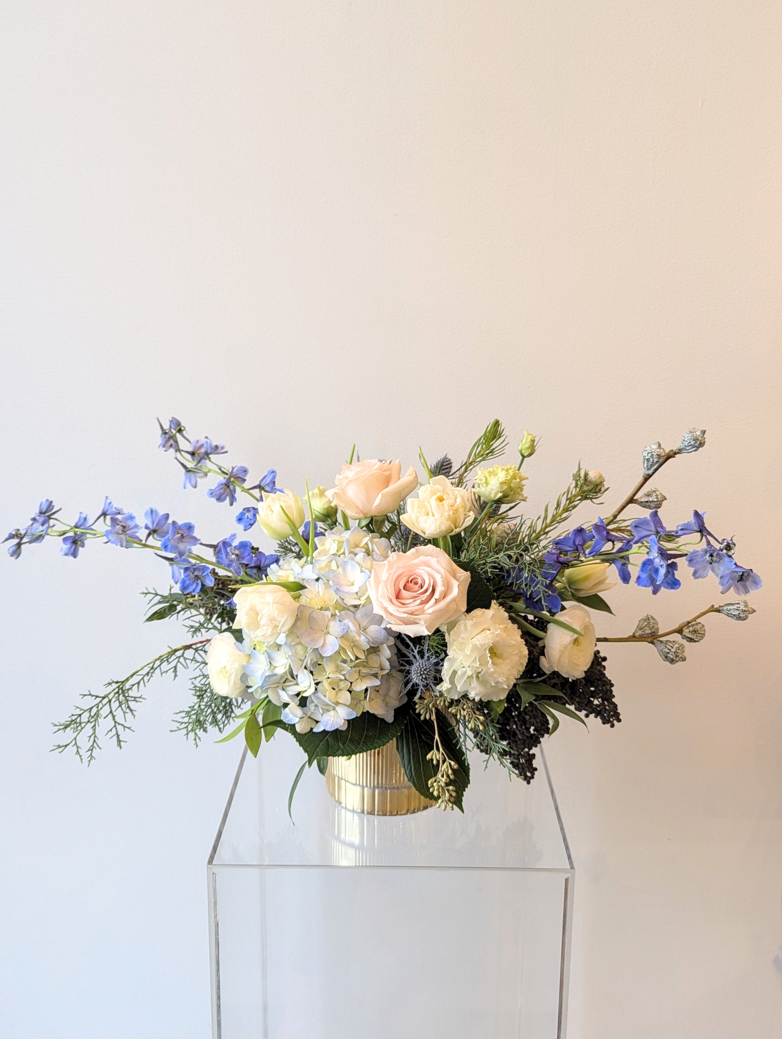 Crisp whites, icy blues, and touches of soft blush accented with fragrant evergreens to offer a touch of winter charm. This arrangement is perfect for Hanukkah, as a hostess gift, or to grace your holiday table.