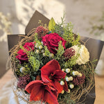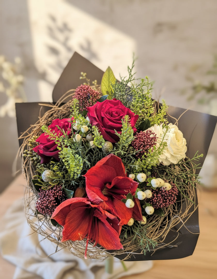 Inspired by the charm of European holiday markets, Wintertide Nest is a thoughtfully curated Christmas bouquet nestled in a handcrafted twig collar. Lush seasonal blooms—roses, berries, and wintry accents—are artfully arranged to evoke rustic elegance and festive warmth. Perfect as a gift or centerpiece, this unique design brings the beauty of a winter forest indoors, celebrating the magic of the season.