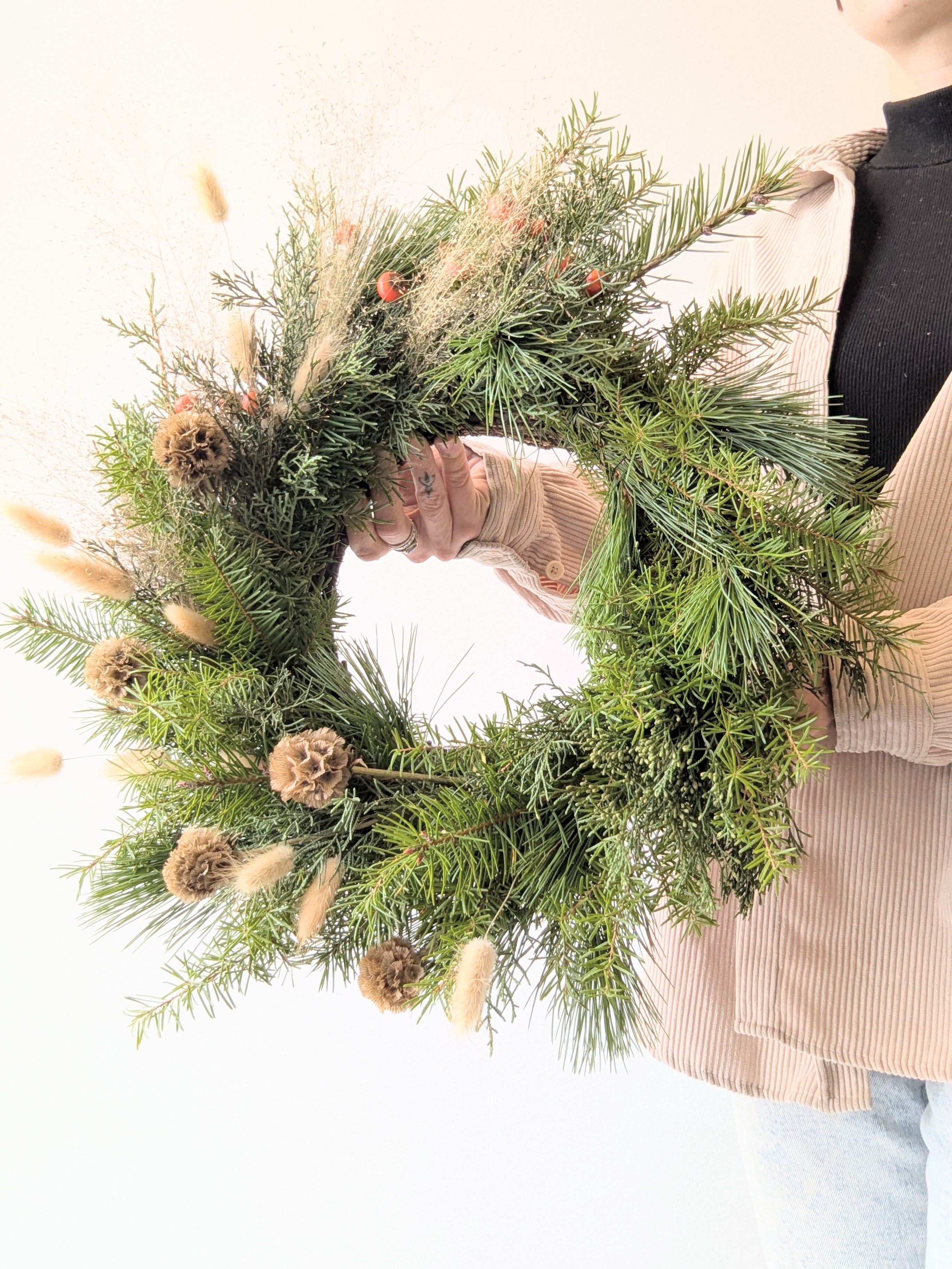 Join us in the studio for one of our favourite seasonal traditions — creating lush, fragrant Yuletide wreaths using all Canadian-grown evergreens and botanicals.